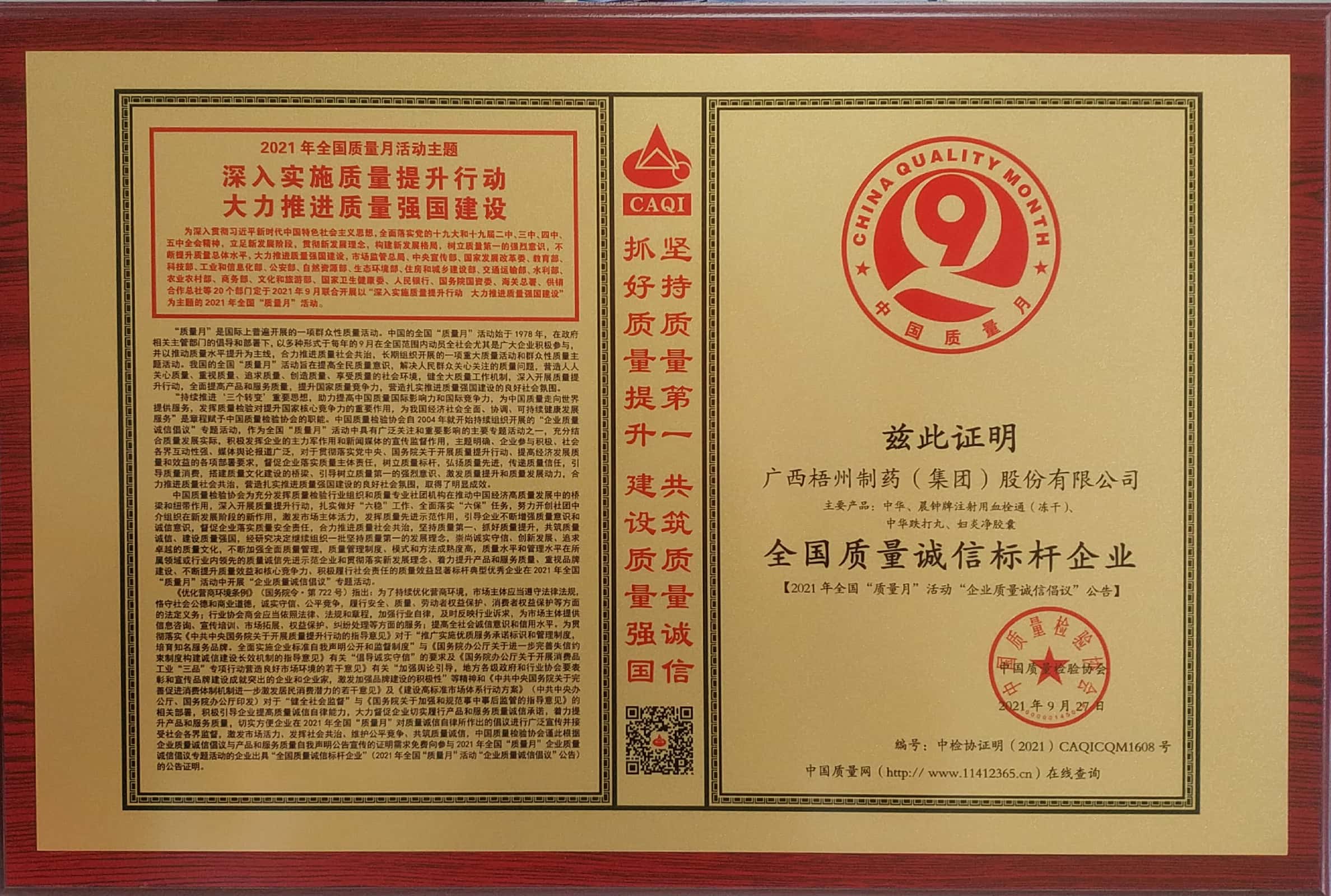 在2021年全國"質量月"活動中榮獲 全國質量誠信標桿 企業(yè)稱號。