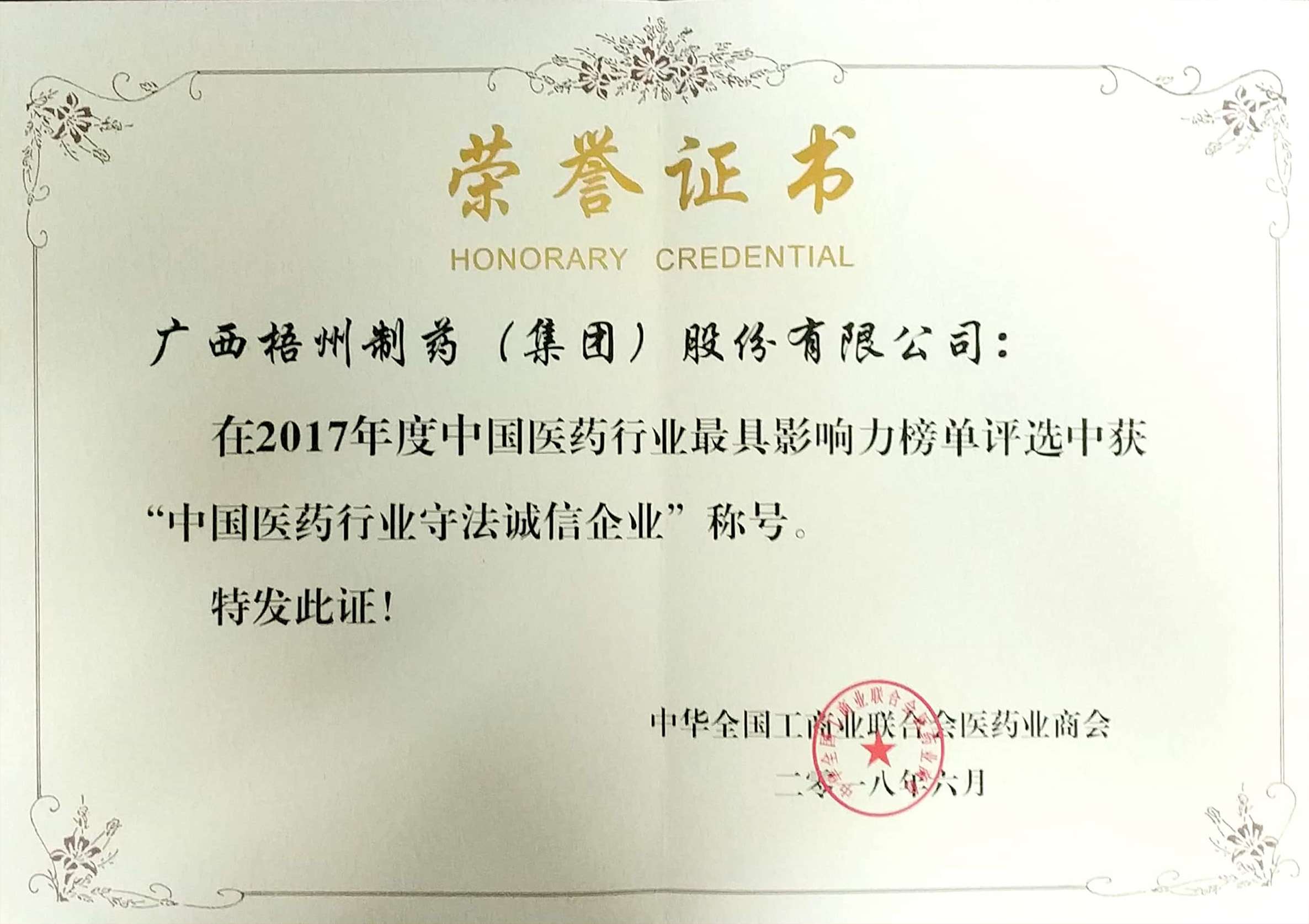 榮獲2017年度中國(guó)醫(yī)藥行業(yè)守法誠(chéng)信企業(yè)稱(chēng)號(hào)