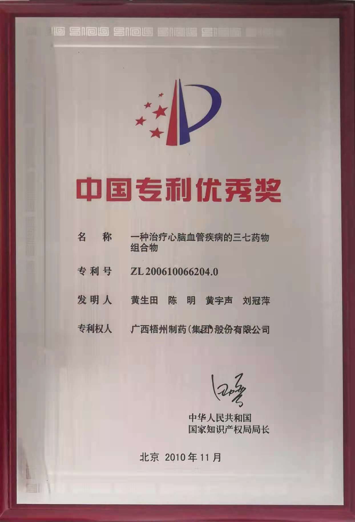 黃生田、陳明、黃宇聲、劉冠萍參與的《一種治療心腦血管疾病的三七藥物組合物》獲得中國專利優(yōu)秀獎
