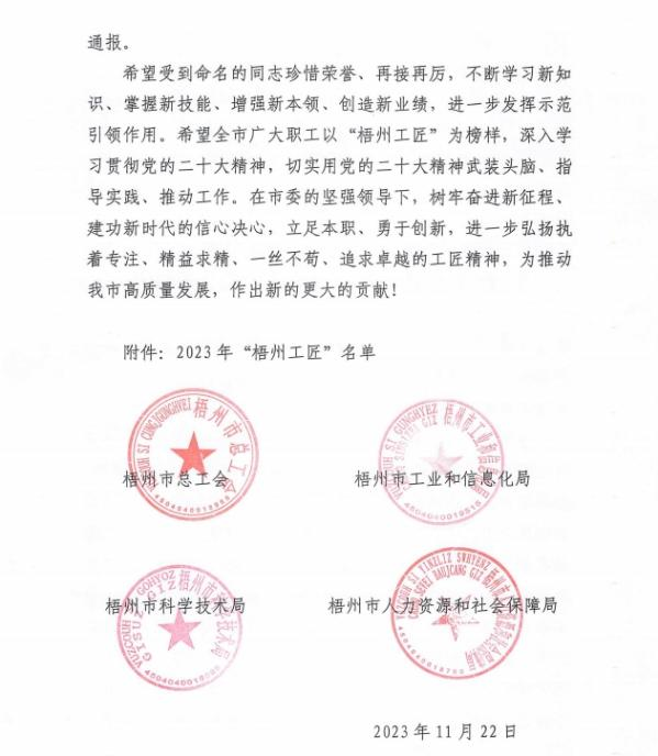 近日,梧州市總工會(huì)、梧州市工業(yè)和信息化局、梧州市科學(xué)技術(shù)局、梧州市人力資源和社會(huì)保障局聯(lián)合發(fā)布《關(guān)于命名2023年“梧州工匠”的通報(bào)》,梧州市有10名同志被選樹為“梧州工匠”,其中,梧州制藥固體車間化吳純芬獲此殊榮。