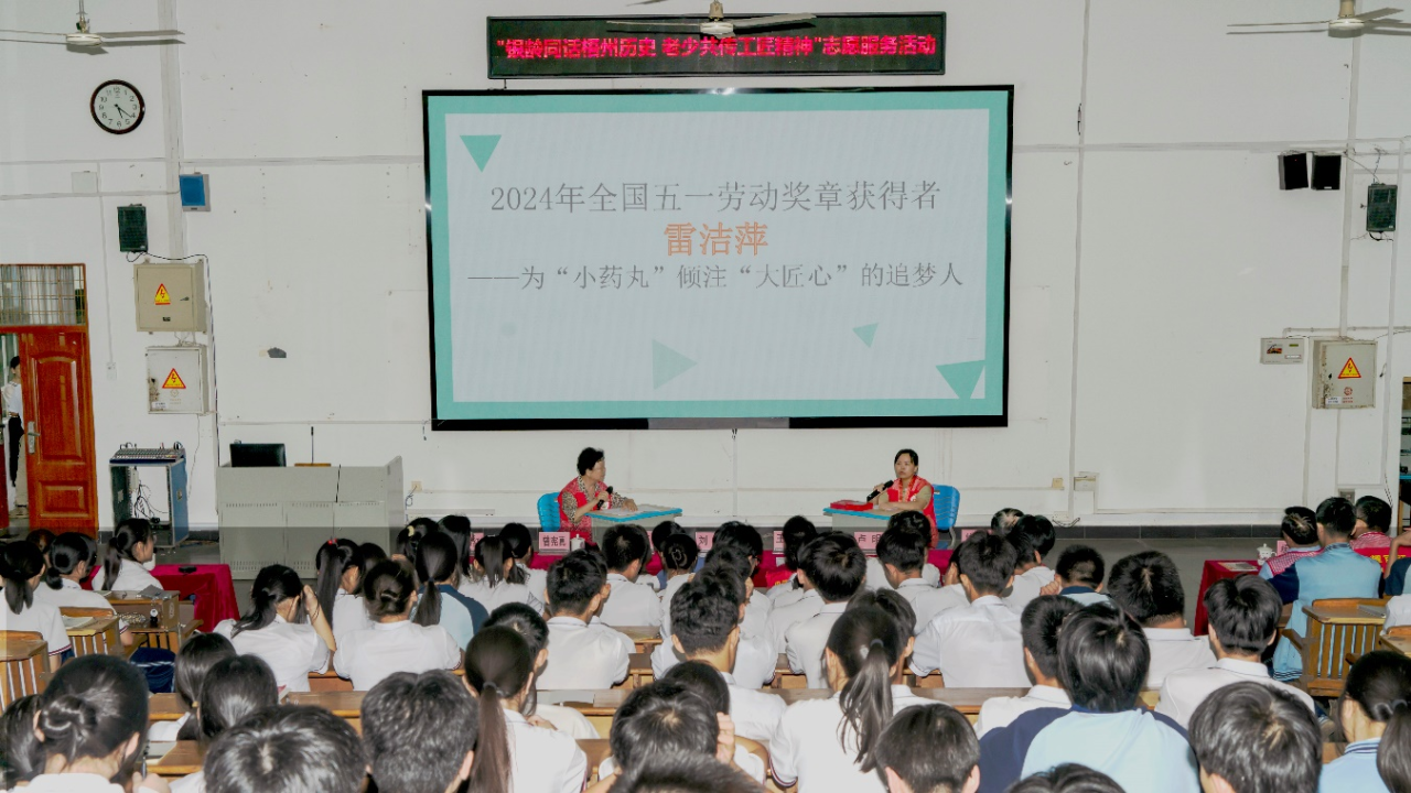 近日,在梧州市第一中學(xué),一場別開生面的“巾幗勞模進校園”開講了,由中共梧州市委員會老干部局主辦的“銀齡同話梧州歷史 老少共傳工匠精神”志愿服務(wù)活動,梧州制藥固體車間工藝與技術(shù)主管雷潔萍受邀作為宣講代表出席活動。