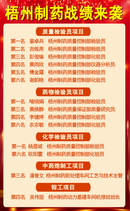 其中,姜卓兵、古煉燕、彭俊瑜、黃雨欣、傅金霞、謝韻艷包攬了質(zhì)量檢驗(yàn)員項(xiàng)目的前六名殊榮;喻俏娟、黃煥靜、李健婷、農(nóng)宗敏在藥物檢驗(yàn)員項(xiàng)目中分別榮獲第一、第三、第四、第六名;楊顯斌、歐陽(yáng)蕾在化學(xué)檢驗(yàn)員項(xiàng)目中分別榮獲第一和第六名;潘譽(yù)文在中藥炮制工項(xiàng)目榮獲第三名;吳偉堅(jiān)在鉗工項(xiàng)目中榮獲第四名。