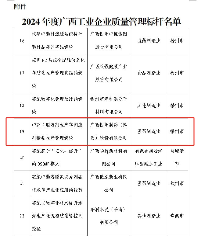 近日,廣西壯族自治區(qū)工業(yè)和信息化廳公布了2024年度廣西工業(yè)企業(yè)質(zhì)量管理標(biāo)桿名單,梧州制藥“中藥口服制劑生產(chǎn)車間應(yīng)用精益生產(chǎn)管理經(jīng)驗(yàn)”成功入選,公司連續(xù)第三年榮獲“廣西工業(yè)企業(yè)質(zhì)量管理標(biāo)桿”稱號。