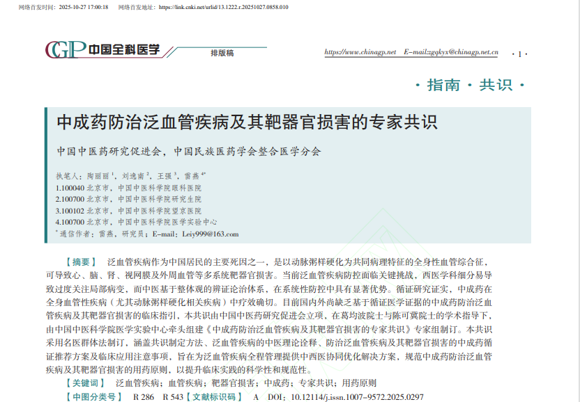 此次發(fā)布的專家共識,由葛均波院士、陳可冀院士擔任學術指導,匯聚了43位來自全國19個省、自治區(qū)、直轄市,專業(yè)領域覆蓋心血管、腦血管、腎臟、眼、外周血管及內分泌等泛血管疾病核心方向的權威專家。