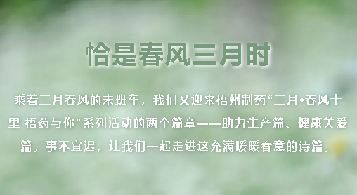 陽春三月,一個(gè)萬物復(fù)蘇、生機(jī)勃發(fā)的季節(jié)。梧州制藥以“三月?春風(fēng)十里 梧藥與你”為主題開展系列活動(dòng),通過豐富的企業(yè)文化活動(dòng),滋養(yǎng)精神,凝聚力量,營造積極向上、和諧溫馨的工作氛圍,不斷增強(qiáng)