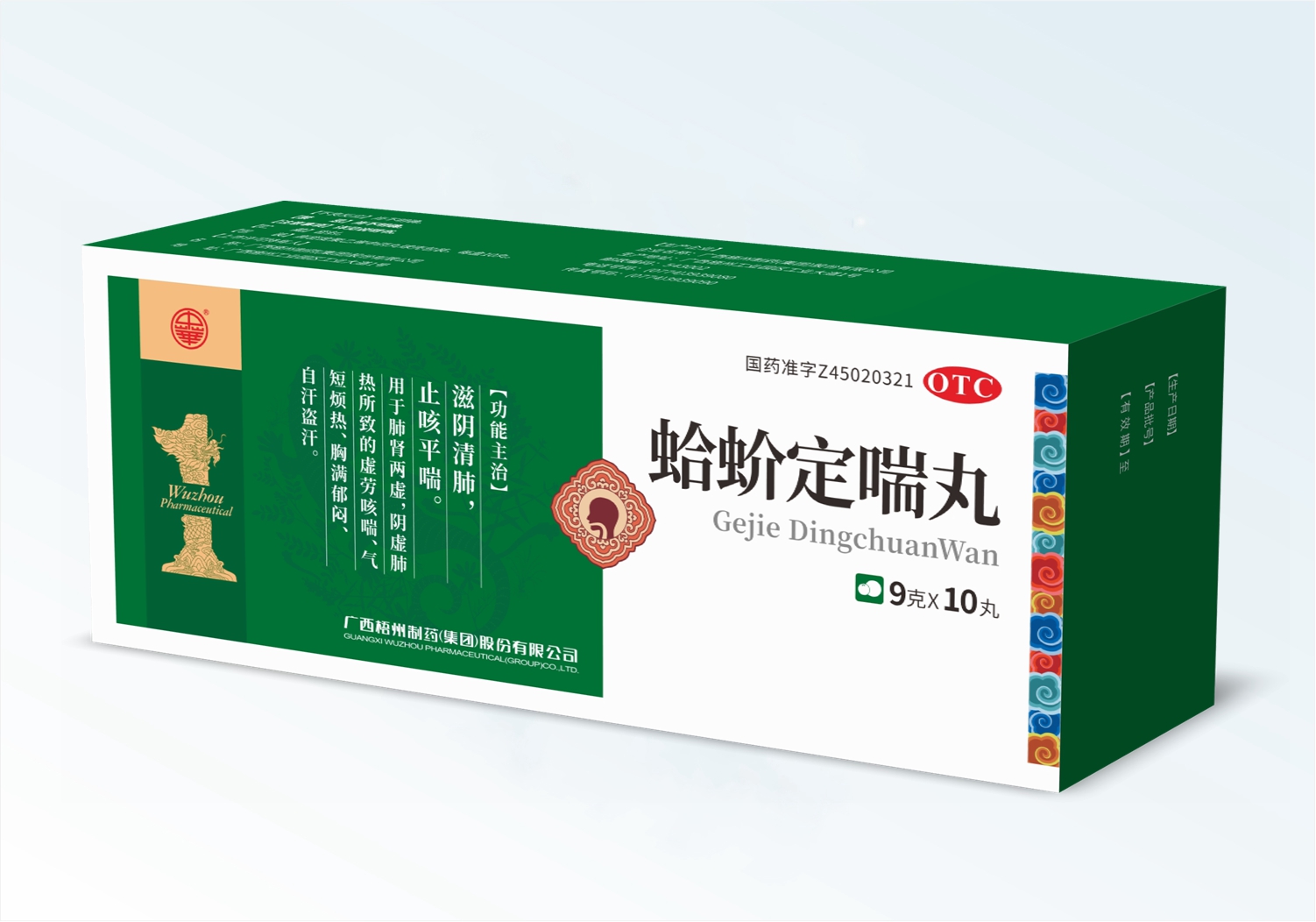 【藥品名稱(chēng)】通用名稱(chēng):蛤蚧定喘丸漢語(yǔ)拼音:Gejie DingchuanWan【成份】蛤蚧、瓜萎子、紫菀、麻黃、醋鱉甲、黃苓、甘草、麥冬、黃連、百合、炒紫蘇子石膏、炒苦杏仁、煅石膏。輔料為蜂蜜。【性狀】本品為黑褐色的大蜜